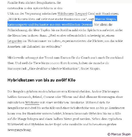 Die besondere Bedeutung der Tasthaare bei allen Katzen hebt zudem selbst Skupin im allgemeinen Teil seines Buchs „Sphynx - Die nackte Wahrheit“ hervor. Er führt hierzu aus: „Die Tasthaare sind an den Haarwurzeln…mit zahlreichen Nerven verbunden, von denen Signale ans Gehirn der Katze weitergeleitet werden. So können z. B. enge Stellen unabhängig vom Sehsinn der Katze 'gemeldet' werden. Die Vibrissen sind bereits bei Neugeborenen voll entwickelt (im Gegensatz zum Seh- und Gehörsinn) was die Wichtigkeit dieses Sinnes gerade für die junge Katze zu verdeutlichen scheint.“ (S. 31 f.)